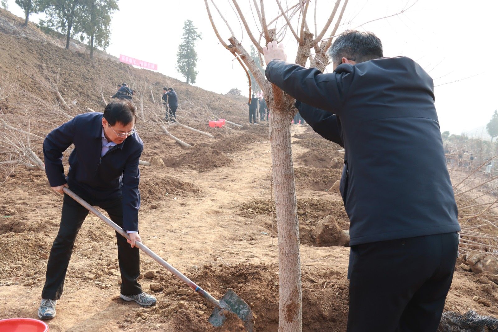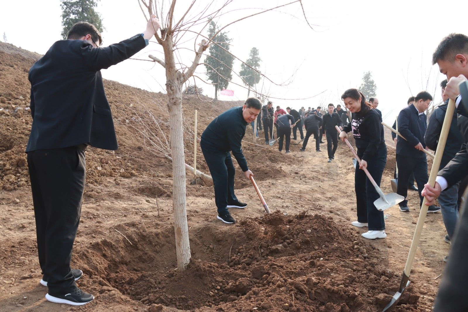 县各大班子领导,县委办、县政府办、县自然资源和规划局、磨山镇、县文旅集团、中铁二十三局集团等100余名干部职工参加义务植树活动,共栽植侧柏及红叶石楠、元宝枫、黄栌等彩化树种2000余株。