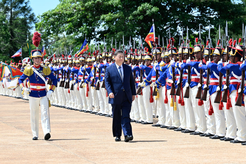 习近平指出,很高兴在中巴建交50周年这个具有重要历史意义的年份访问巴西。刚才卢拉总统为我举行最高礼遇的隆重欢迎仪式,充分体现了对中巴关系的高度重视以及对中国人民的深情厚谊,令我深受感动。中国和巴西是东西半球两大发展中国家。回首过去50年,中巴关系跨越山海,探索出发展中大国相互尊重、互利友好、合作共赢的正确相处之道。巴西是首个同中国建立战略伙伴关系的国家、首个同中国建立全面战略伙伴关系的拉美国家。近年来,在我和卢拉总统战略引领下,两国日益成为命运与共的可靠朋友、共促和平的积极力量,中巴关系正处于历史最好时期,不仅增进了两国人民福祉,也维护了广大发展中国家共同利益,壮大了全球南方的力量和声音,为世界和平稳定作出突出贡献。