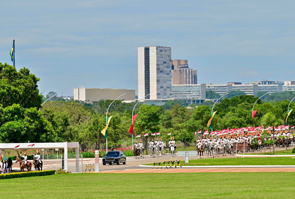 初夏时节的巴西利亚,天朗气清。黎明宫内,绿草如茵,450名威武礼兵整齐列队。在120名龙骑兵护卫下,习近平乘车抵达黎明宫前广场。