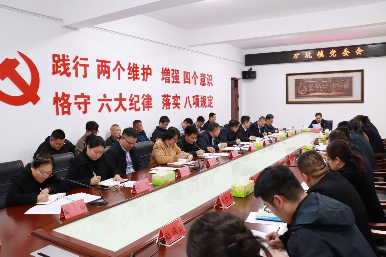 王康亮要求,要在党建引领上走在前,压紧压实责任,从严管党治党,抓实换届选举工作,建强基层战斗堡垒,锻造过硬干部队伍,继续以高质量党建引领高质量发展。要在产业发展上走在前,壮产业、强链条、补短板,抓好“双招双引”、建强园区载体、优化营商环境,奋力跑出发展加速度、树立镇域新标杆。要在和谐稳定上走在前,始终保持“时时放心不下”的责任感,树牢“人人心中有责”的担当意识,守牢安全生产底线,兜牢生态环保红线,筑牢社会稳定防线,营造平稳有序的发展环境。要在作风建设上走在前,进一步强化责任意识、增强工作主动,严守纪律规矩、狠抓任务落实,相互团结、密切合作、实干担当、清正廉洁,不断推动矿坑镇各项工作迈上新台阶。