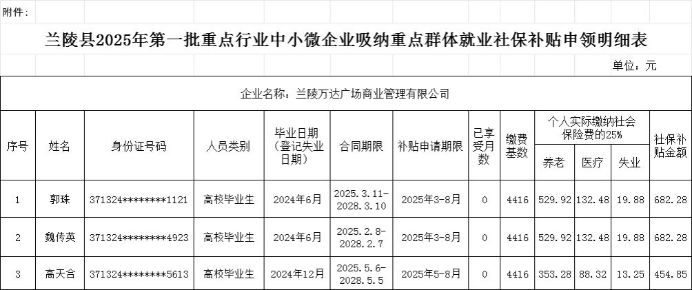 附件:兰陵县2025年第一批重点行业中小微企业吸纳重点群体就业社保补贴申领明细表